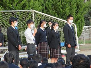 中学段階の部活動は既に引退している3年次生たちが,これから新人大会へ出場しようとしている1・2年次生に対して,応援団やチアを中心に吹奏楽部の演奏も合わせてエールを送ったり,応援のためのちょっとした芝居を演じたり,みんなで歌ったりして盛り上げていました。また,1・2年次の各部活動の代表者は,それぞれが強い決意で抱負を述べてくれました。どの部活動も新人大会に向けての気持ちがさらに高まったようでした。これからも生徒たちへの応援をよろしくお願いします。