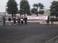 この日、学校から会場となる筑波大学へ向けてバス2台が出発しました。朝、6時40分の出発に合わせて校長先生をはじめ、たくさんの先生方が見送りに来てくれました。先生方は「GO FOR IT ! 頑張れ!」と校長先生からの熱きメッセージ入り横断幕を掲げ、6年次生を見送りました。